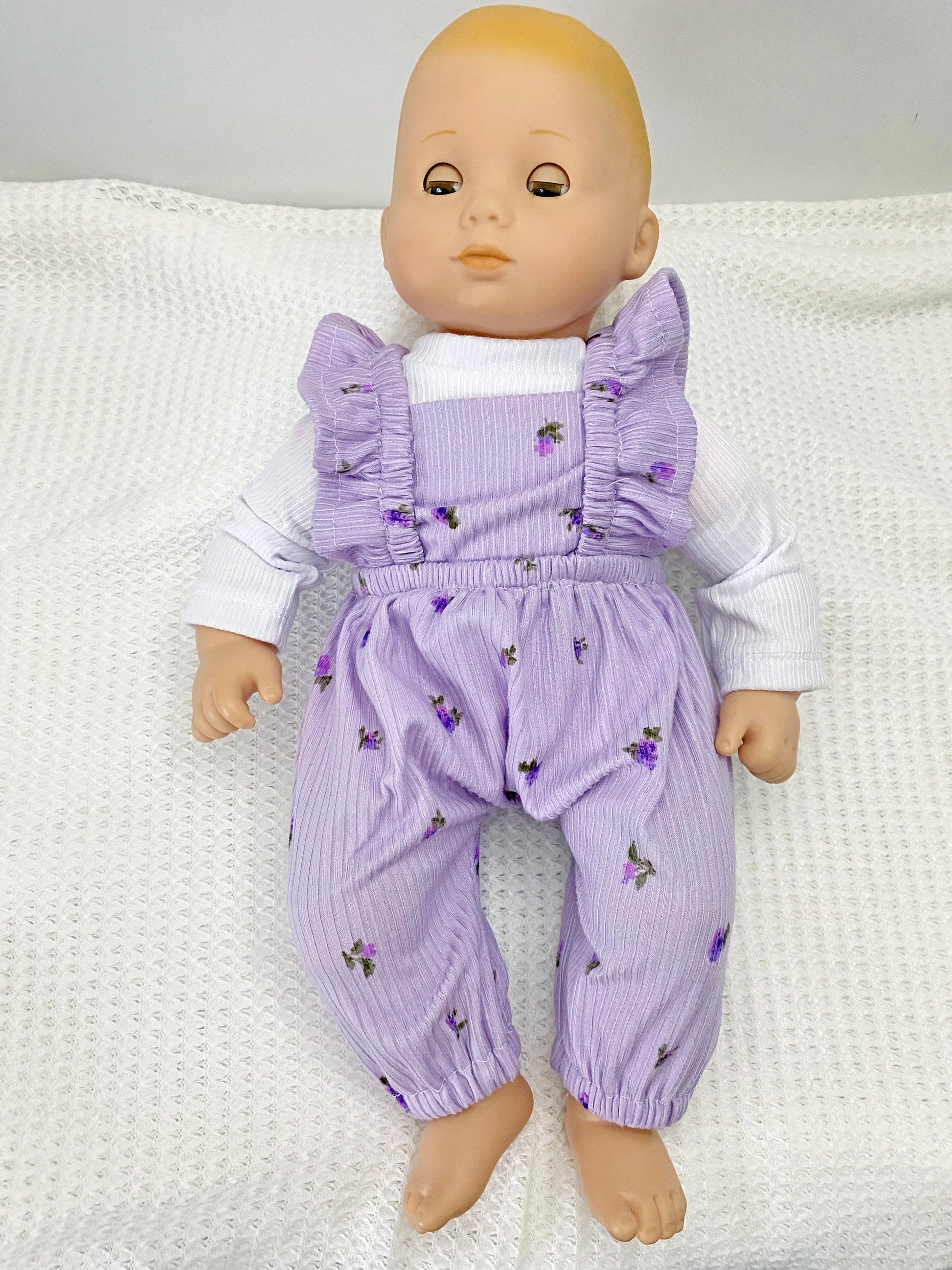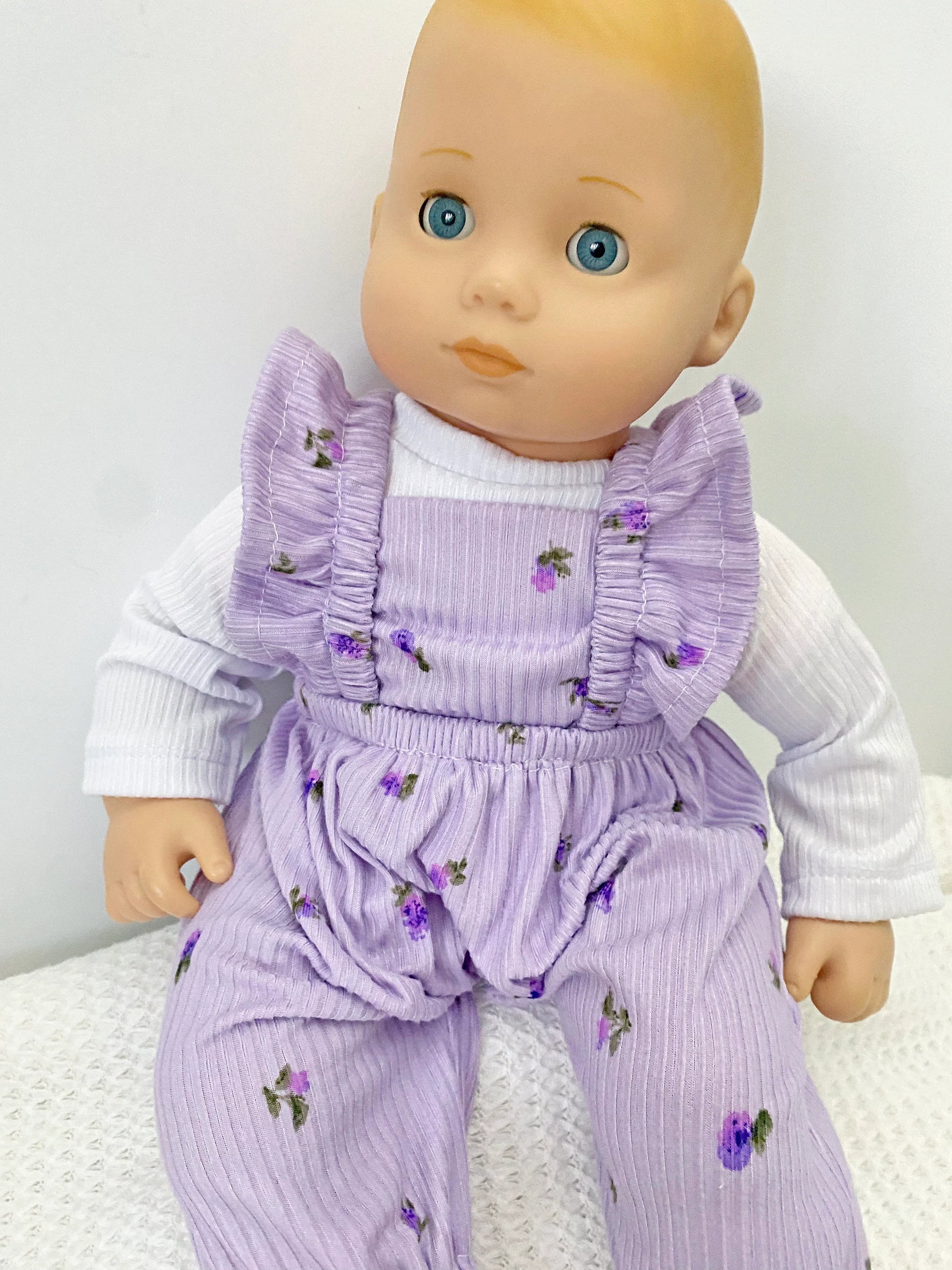 This pattern is for the ruffle strap romper to fit the 15" soft body dolls such as Bitty Baby, Alex Star, Gotz, and the Reborn 15.7" doll. You can hem the pants with a straight leg or elasticized hem.
