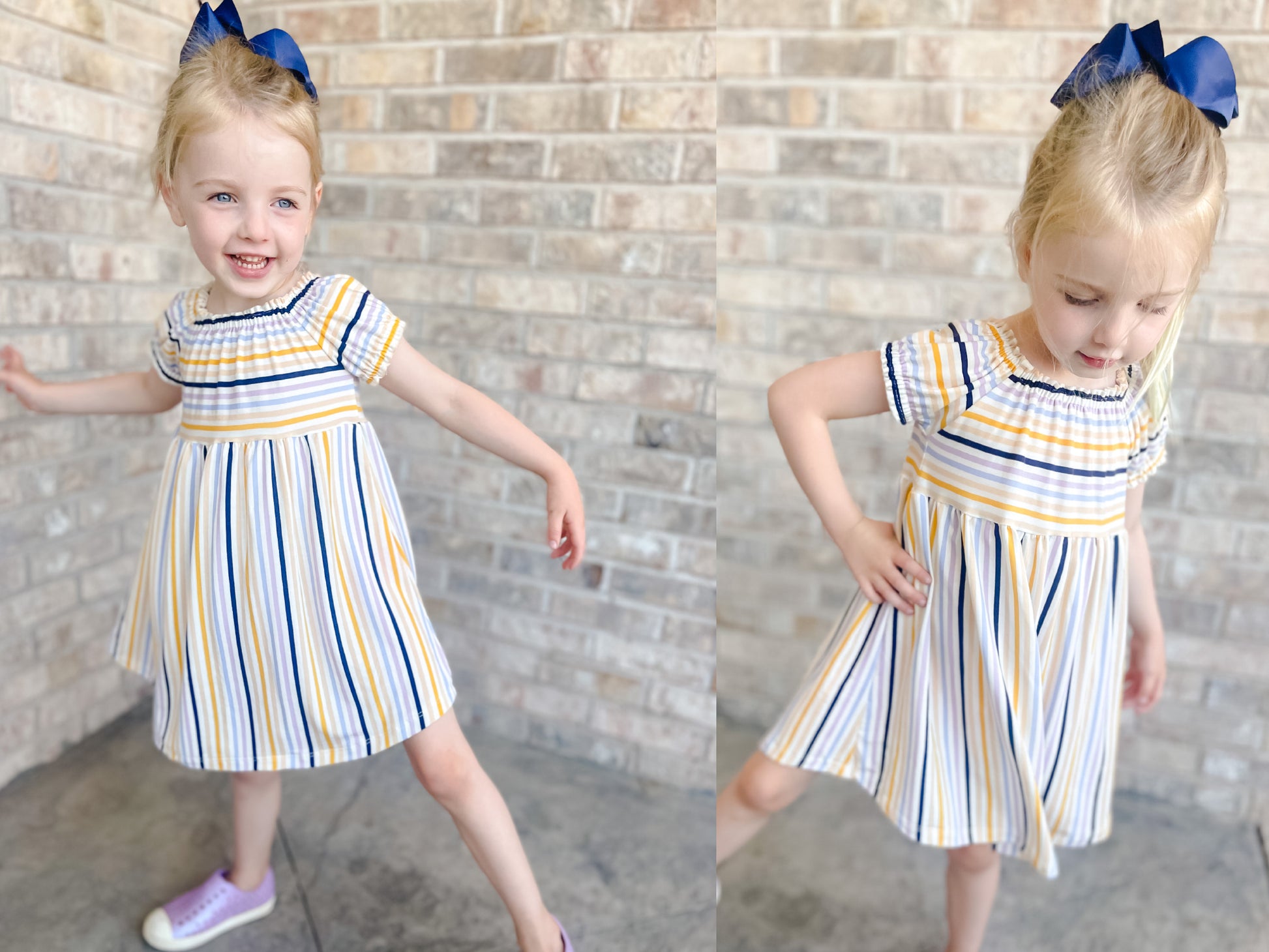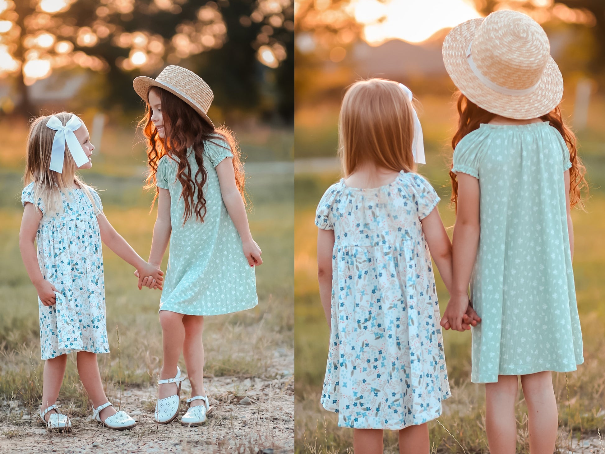 There is a dress option as well as a romper option. Long or short sleeves are available for both. Dress and romper each have an option for a gathered high waist or a plain straight front. The romper neckband offered enough stretch to dress feet first. The neckline can be worn at neck or off the shoulders. Sleeve hems can be finished with elastic just like the neck, lettuce edge or a hem of your choice.